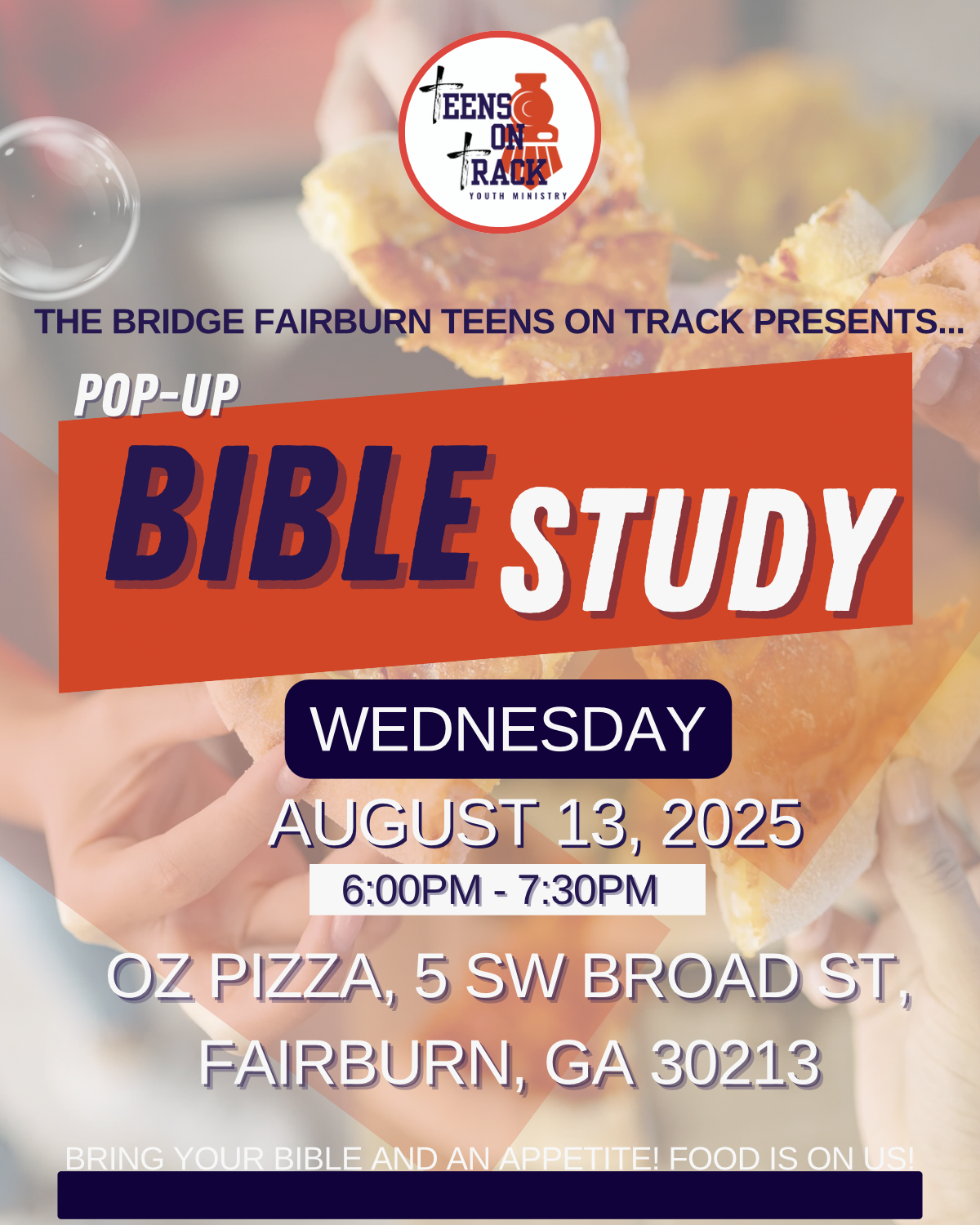 This monthly gathering to study the Word of God and enjoy fellowship out in our community is open to new and returning students. Meet at Oz Pizza in Fairburn, and be sure to bring a physical Bible with you. Pizza is on us!